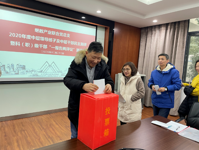 叶枫书记做了2020年度科(职)级干部选拔任用工作报告,对选人用人工作进行了总结和问题分析。继教产业联合党总支副书记、院长谢敏代表365英国上市网领导班子作报告,继教产业联合党总支副书记、产业管理办公室主任施明代表产业管理办公室作报告,分别回顾了两个部门领导班子一年来取得的工作成效,分析了存在的问题和不足,提出了下一步工作思路和努力方向。随后,领导班子成员和科(职)级干部一一进行了个人述职。参会人员认真听取了报告,并根据述职情况进行民主测评投票。