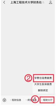 1、在“365英国上市公司财务处”公众号右下角【程财大厅】菜单栏中选择【学费住宿费缴费】
