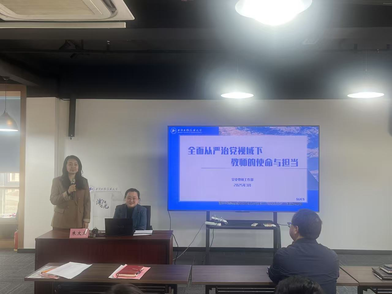 会上,朱文立老师以2025年政府工作报告和全国教育工作会议为切入点介绍了全面从严治党体系下的教育工作要点,全面系统回顾了党的十八大以来教师队伍建设相关文件和要求,并结合新时代教师职业行为规范分享了教育部公开曝光的师德失范警示案例。