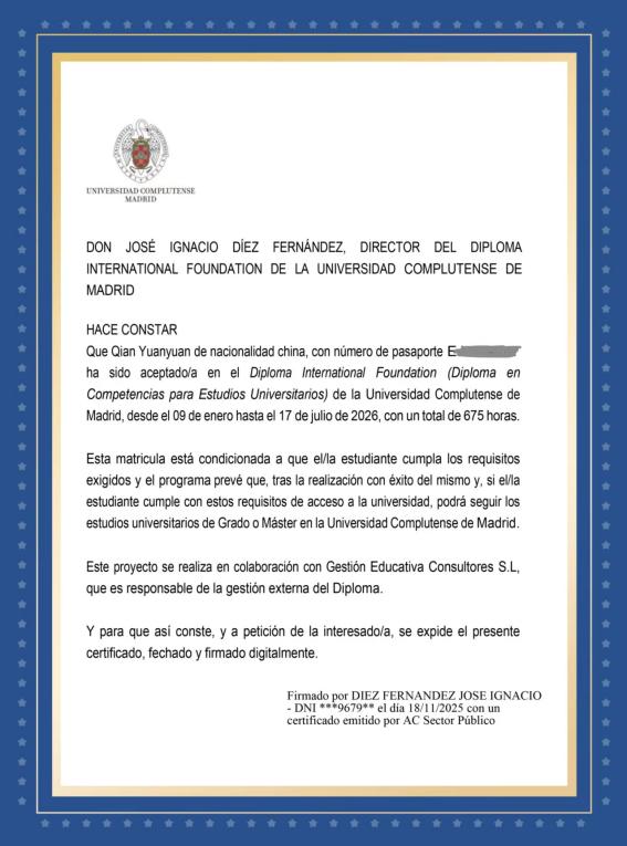 图1:左图为23级同学所获马德里康普顿斯大学预录取通知书;右图为23级同学所获马德里自治大学预录取通知书