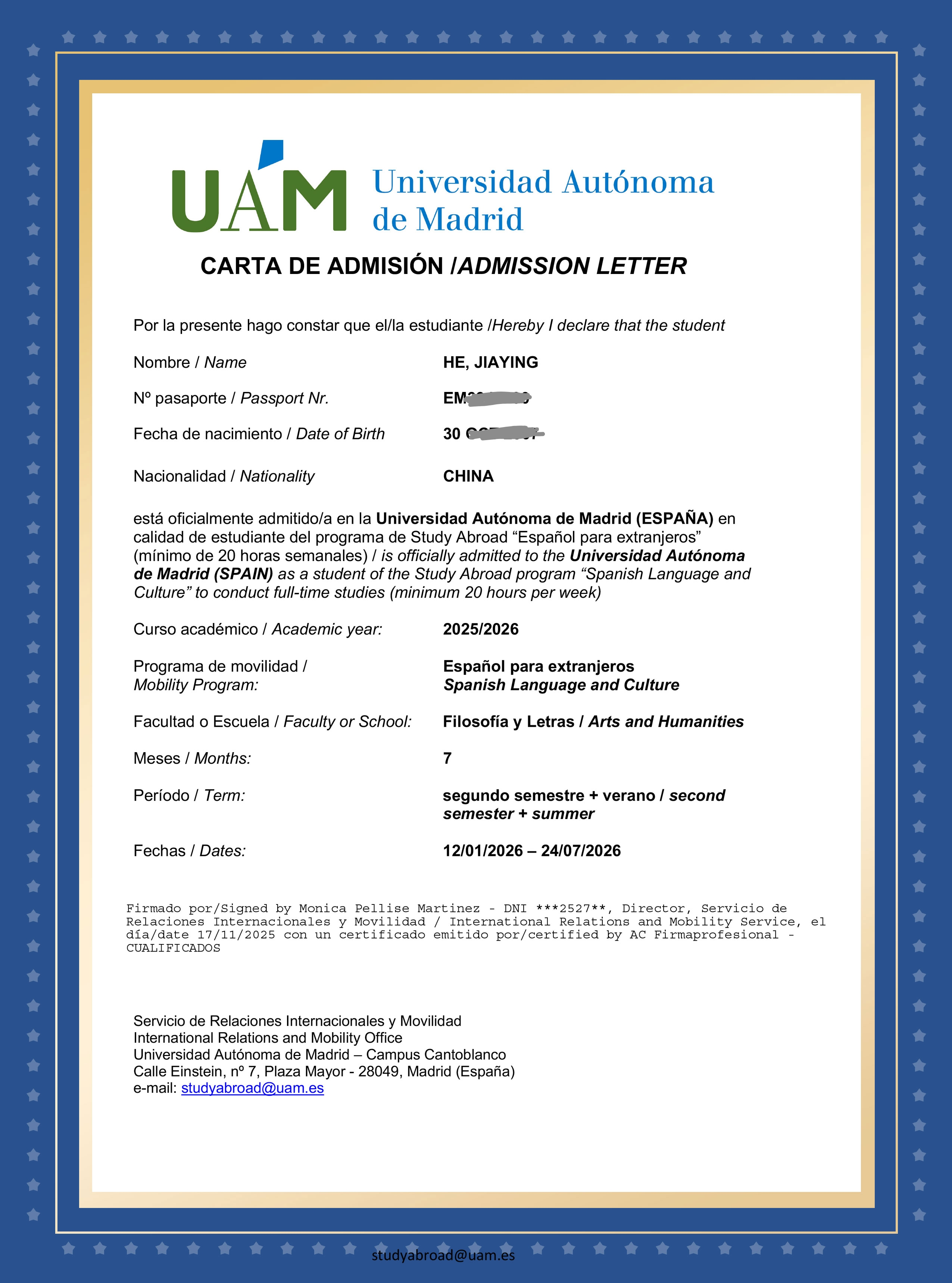 近日,365英国上市网多语种高中项目2023级西语班捷报频传,26名学子凭借扎实的语言功底与优异的综合表现,全部顺利通过马德里康普顿斯大学(QS排名164)、马德里自治大学(QS排名198)两所世界名校的国际预科入学测试,成功斩获预录取通知书!这份骄人的集体成绩,是同学们日夜苦读、不懈拼搏的成果,也是学校精心培养、家校携手共育的生动体现。据悉,这批学子将于2026年1月共赴西班牙,开启崭新的求学之旅。