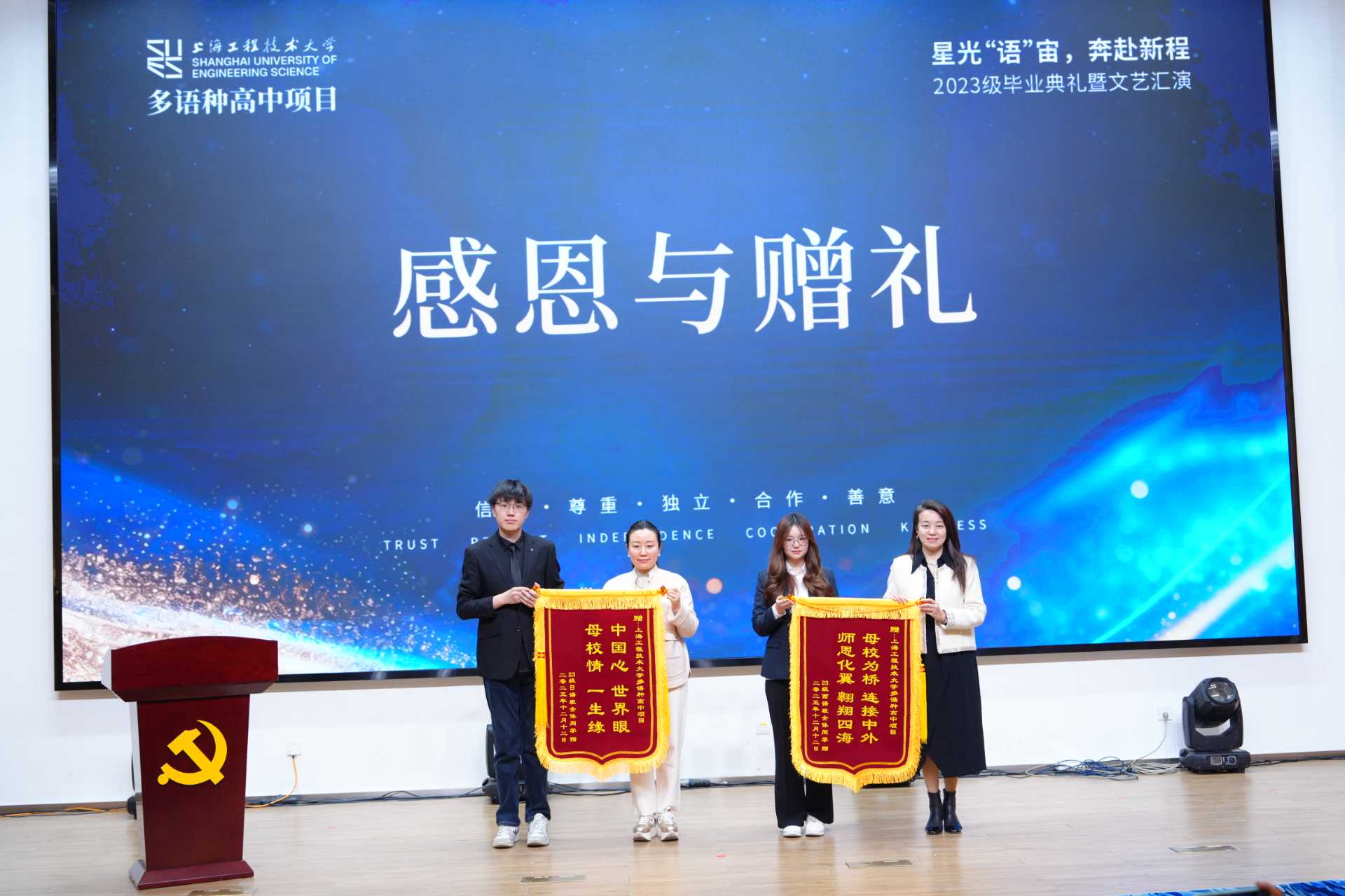 随后,毕业生代表向学院敬赠感恩锦旗,学院领导与教师亦向学生赠送毕业纪念册,完成了情谊的传递与精神的接力。